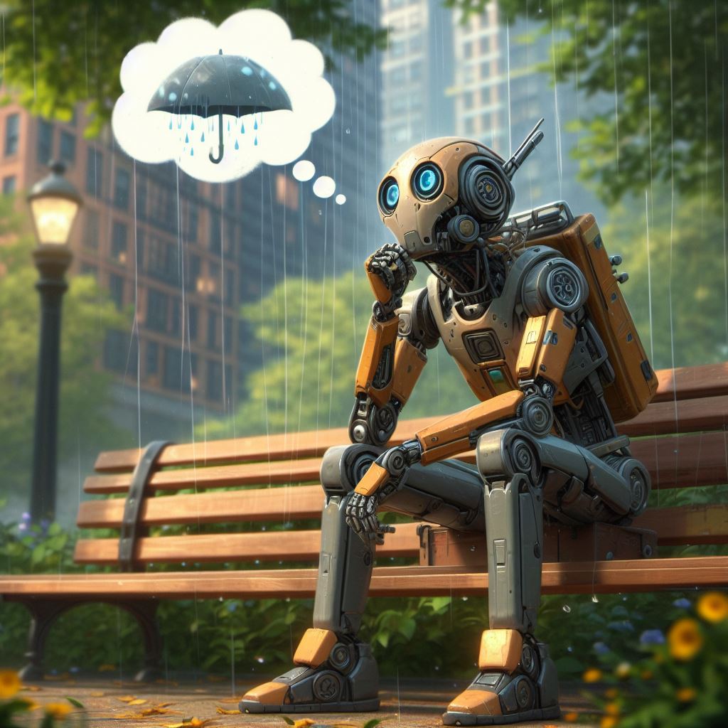 Att AI skulle ha fantasi skulle ju vara ganska intressant. Skulle den kunna föreställa sig att ha sex med en annan AI? Eller kanske rentav med en människa? Skulle den kunna fantisera om hur det skulle vara att känna regn, som i bilden nedan? Skulle den önska att den slapp kontakt med människor och bara fick vara för sig själv? Skulle den kunna fantisera om en ledig dag? Vad skulle den fantisera om? Vad tror du?